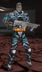 slower and does not give out health pack refills. Equipped with IR goggles, the biotech can see alien classes much more easily and is the only human class able to spot cloaked guardians. A cloaked guardian will appear as a shadow of red on the ground or wall immediately around it. To expose it for other humans to see, simply shoot it or throw a flare. When the biotech is aiming at an enemy class it will glow, allowing other humans to see it easier. She is also equipped with a flash grenade which will shock and disorientate any aliens caught in the blast. The biotech is able to self-heal automatically over time. |